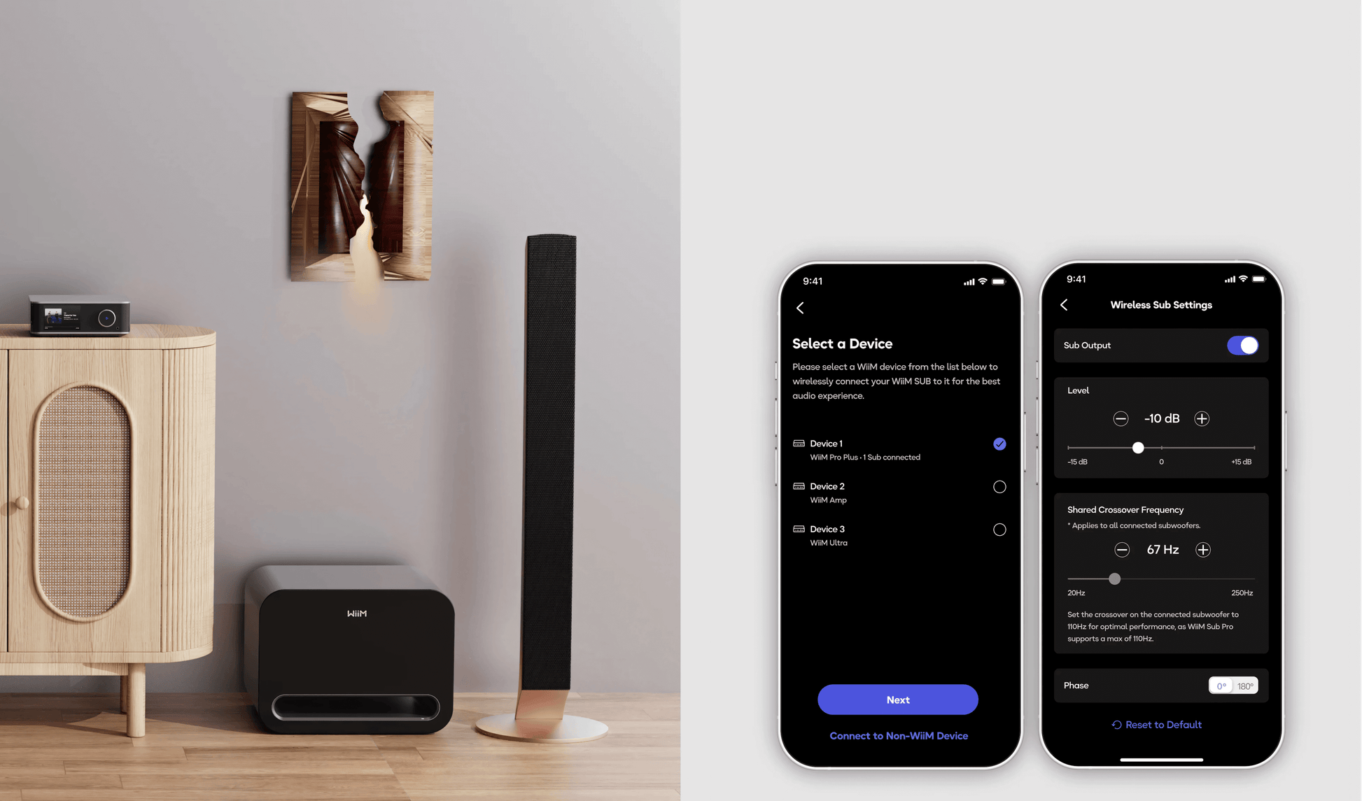 Preko aplikacije WiiM Home lahko uporabnik natančno nastavi vse parametre – od 10-pasovnega parametričnega EQ, nastavljive delilne frekvence (crossover), faze in zamikov (latency) – vse v realnem času, popolnoma brezžično